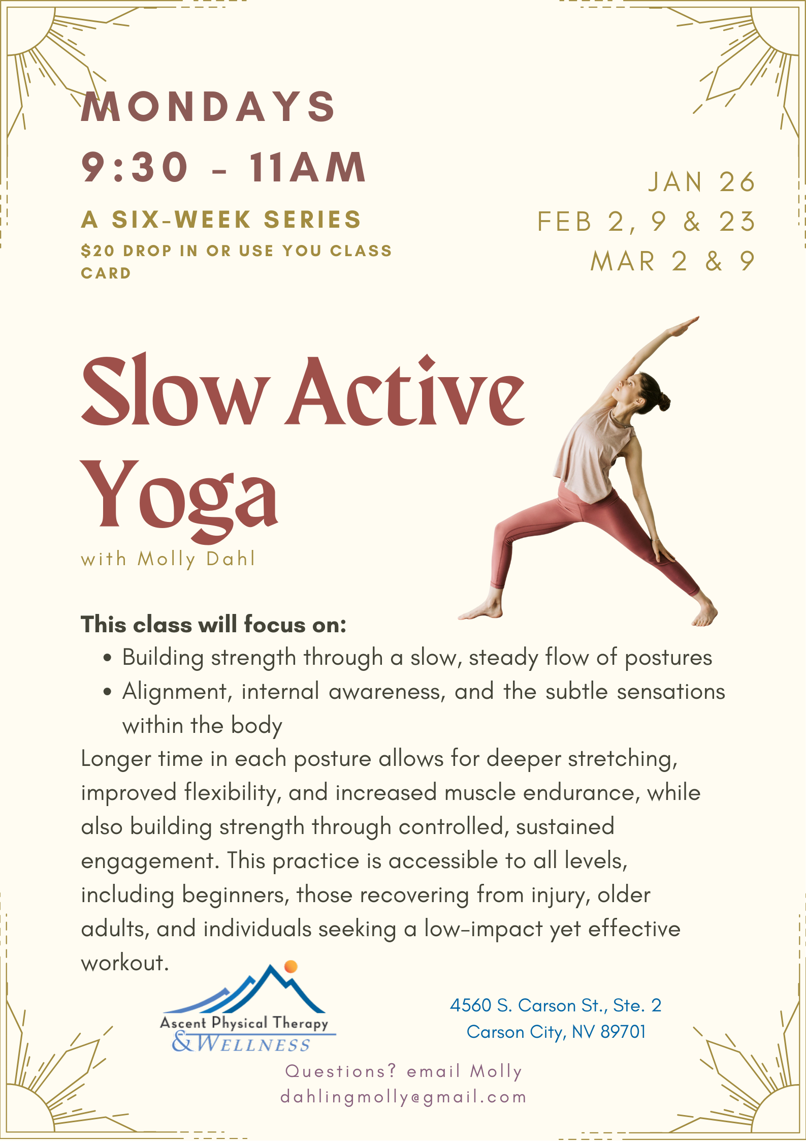 Slow Active Yoga, a special six-week series will be offered starting 1/26/26, 9:30 - 11:00am. $20 drop in or use your class card. Mark your calendar for these dates: